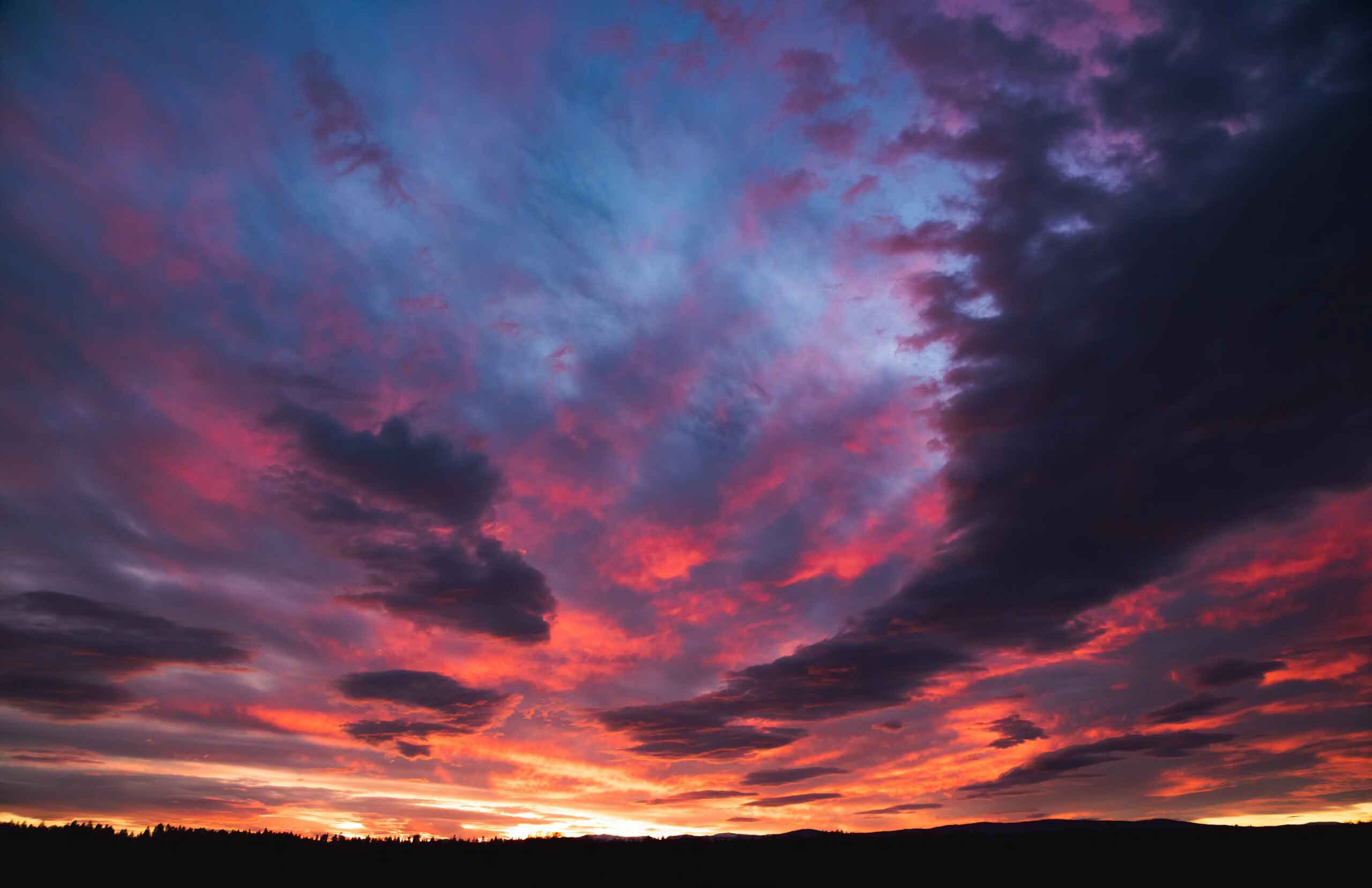Beautiful dramatic sunset over Styrian land in Austria. Colorful winter evening on countryside.